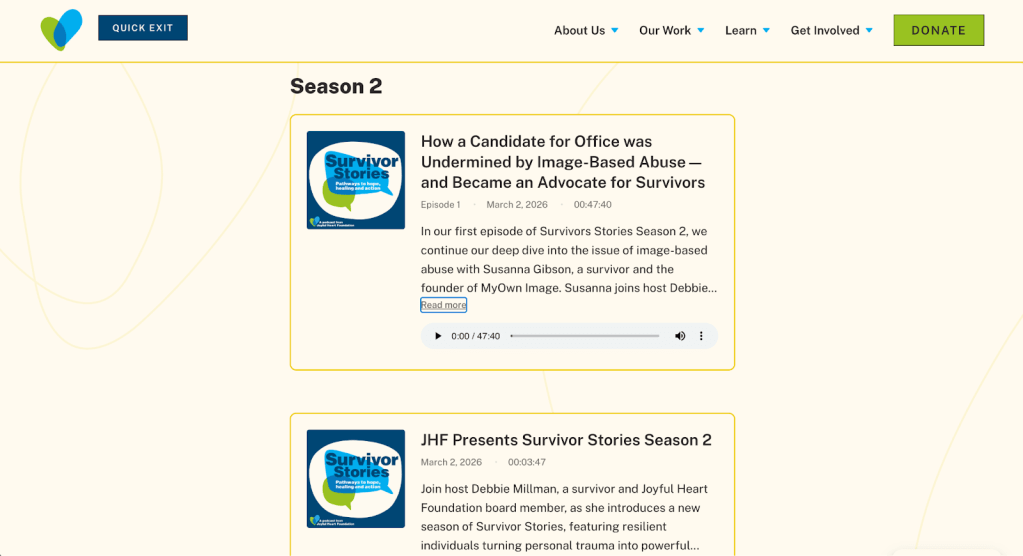 Here’s what that looked like. The screenshots below show the block in action, pulling live episodes from the Joyful Heart Foundation’s Survivor Stories podcast. Want to see it on a real site? Visit the podcast page to see the block live. Want to build your own version? Remix the project in Telex and see how far a single prompt can take you.